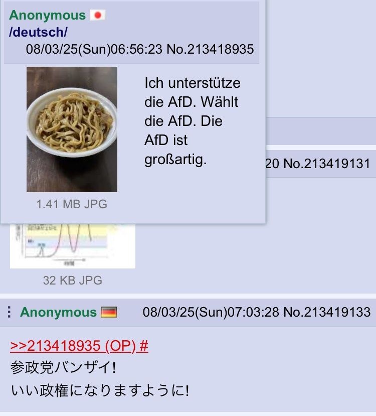 一方で参政党はバラマキと資本規制と徴農の極左カルト経済思想、普通に先の大戦を肯定するキチゲェだから、実際にマニフェスト見たら右翼ドイツ人はドン引きすると思う