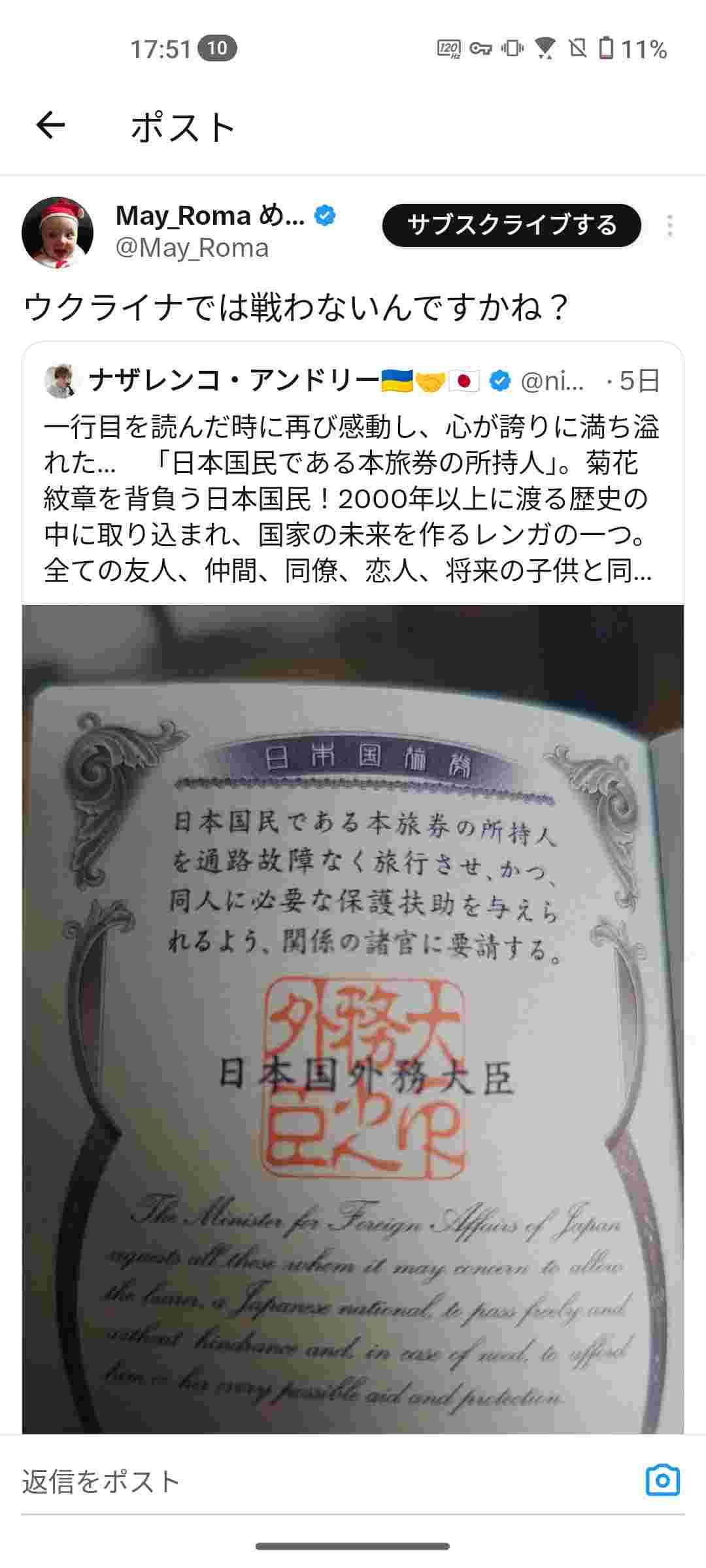 ナザレンゴ「パスポート貰った。一行目見てから感動で震えが止まらん。日本のために戦う」敵「ウクライナでは戦わないんですか?」