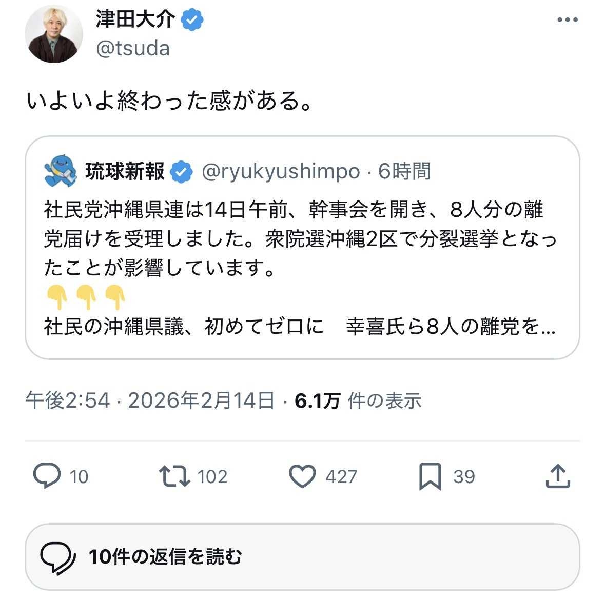 津田大介 (@tsuda) on Xいよいよ終わった感がある。x.com - 2 : 2026/02/14(土) 19:58:57.83 ID:tB7PqGcv0St.V