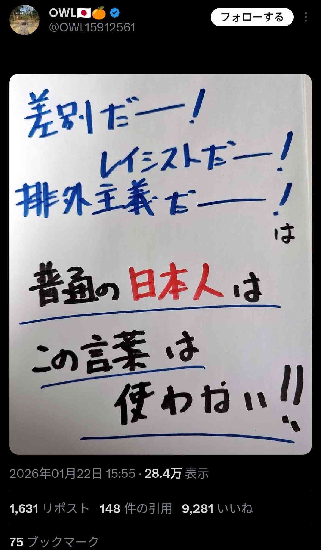反差別は日本人差別ダーッ!って言ってるよね - 90 : 2026/01/25(日) 09:09:37.31 ID:e9ysp4Ah0