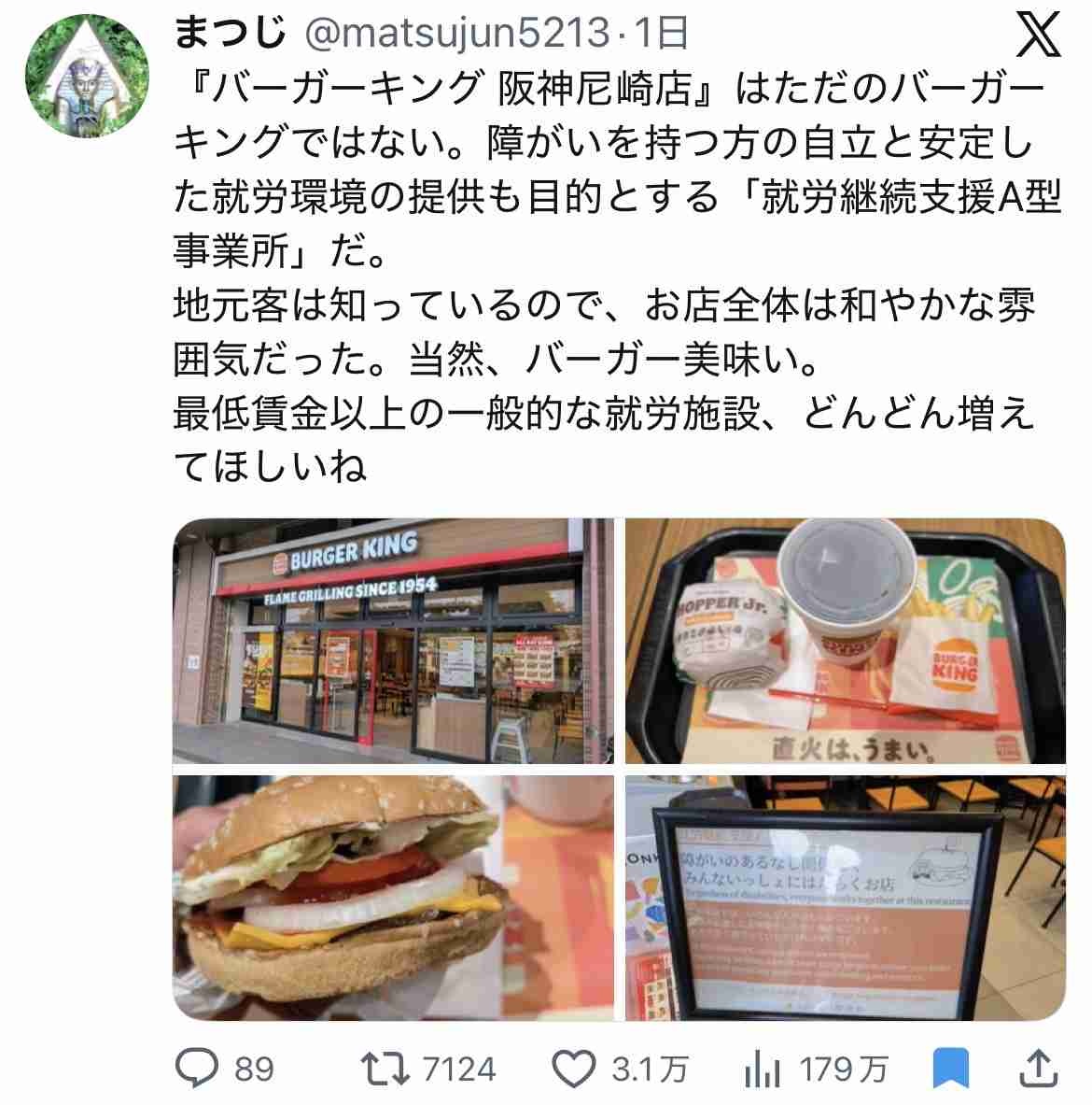 まつじ (@matsujun5213) on X『バーガーキング 阪神尼崎店』はただのバーガーキングではない。障がいを持つ方の自立と安定した就労環境の提供も目的とする「就労継続支援A型事業所」だ。 地元客は知っているので、お店全体は和やかな雰囲気だった。当然、バーガー美味い。 最低賃金以上の一般的な就労施設、どんどん増えてほしいねx.com - 2 : 2026/02/28(土) 03:30:33.40 ID:H8+7H5Dt0