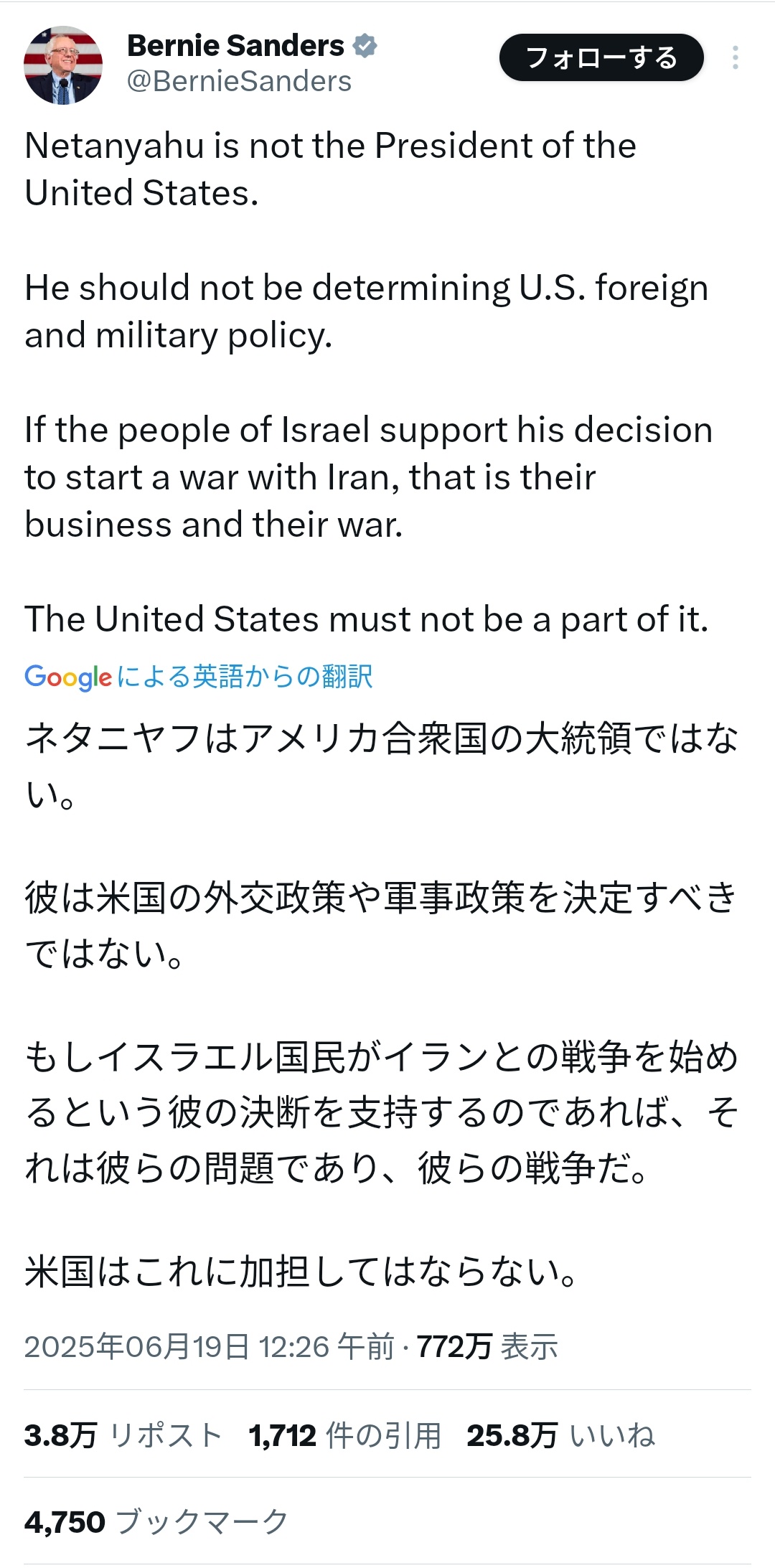サンダース上院議員は、ネタニヤフにアメリカが協力する義務などないって言ってるんだろ - 25 : 2025/06/19(木) 20:21:06.20 ID:k+5OT48ld