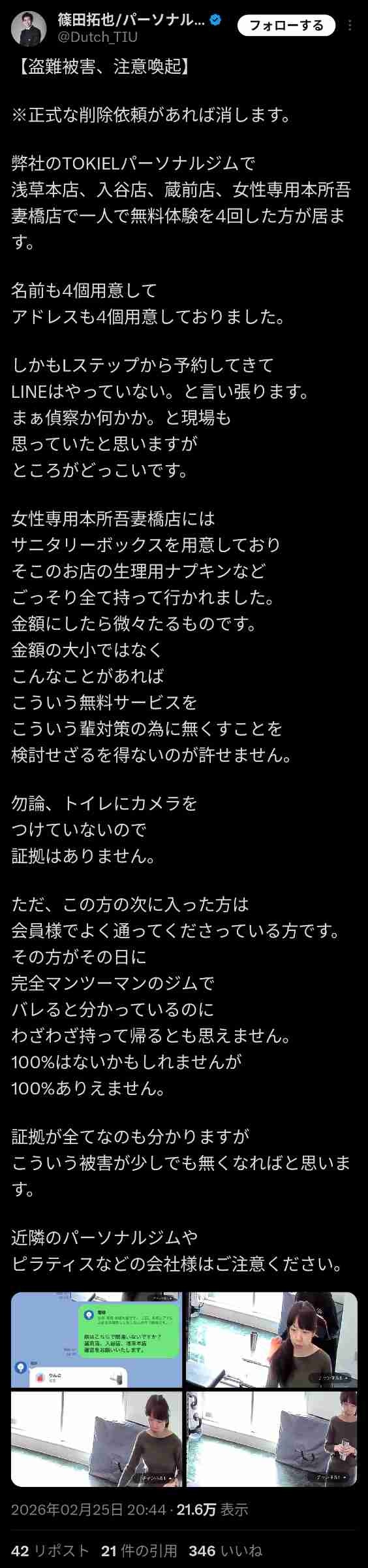 パーソナルジム「何の証拠もないけどこの女が備え付けナプキン窃盗した犯人ぽいから世界中に顔晒すわw」