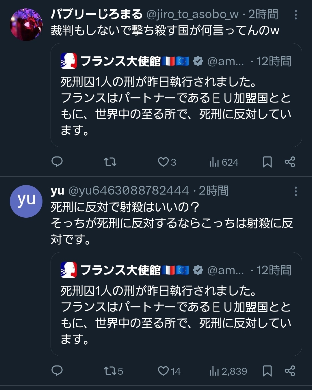 フランス「日本の死刑執行に抗議します」👉野生のネット論客達にボコボコに論破されてしまう・・・