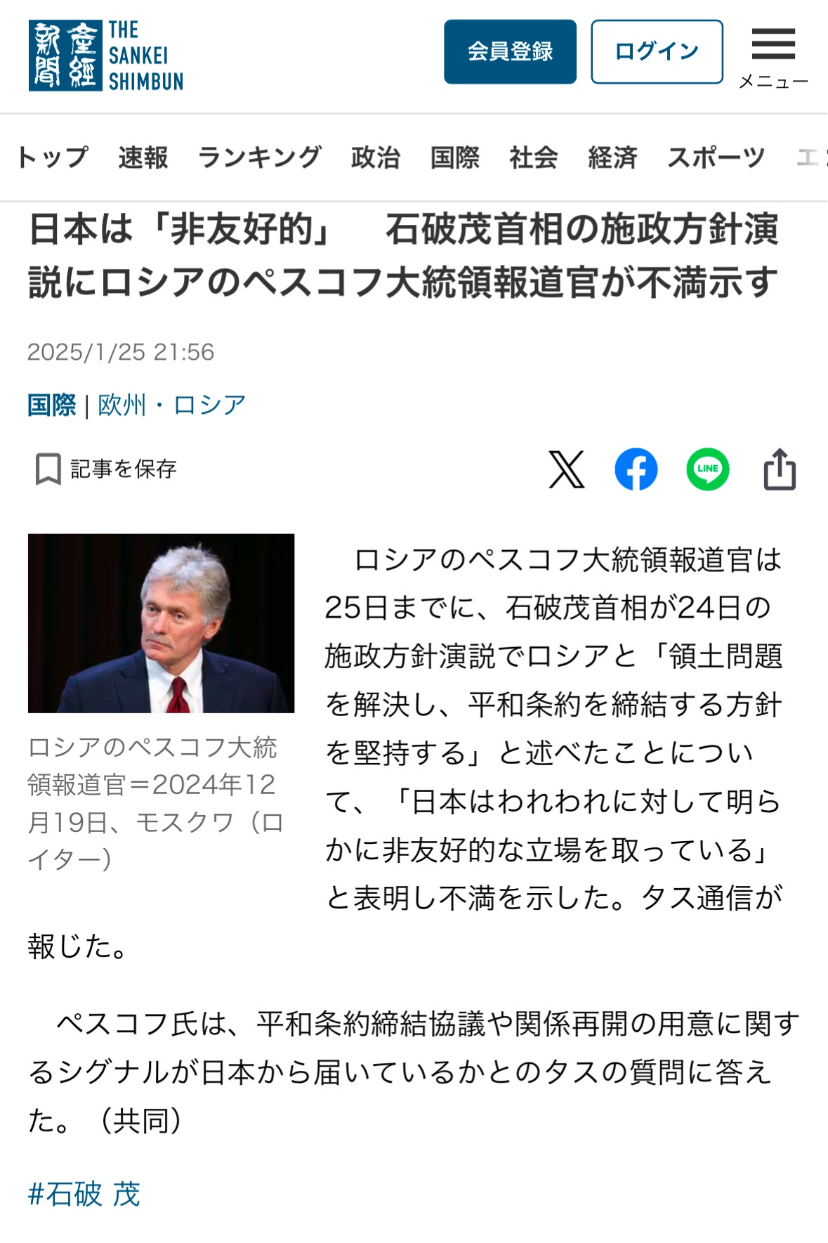 ロシアさん、石破首相の施政方針演説にイライラwwwww