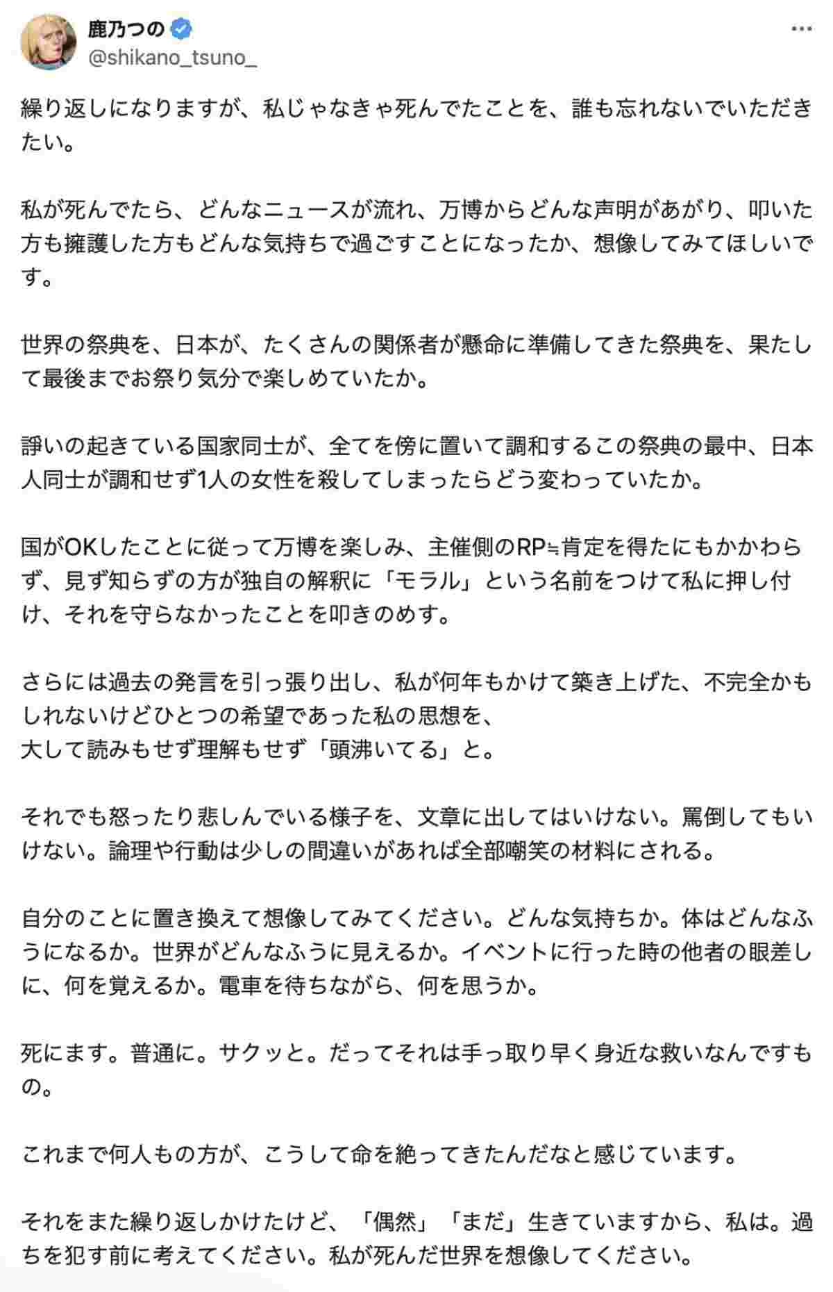 私が死んでたら、どんなニュースが流れ、万博からどんな声明があがり、叩いた方も擁護した方もどんな気持ちで過ごすことになったか、想像してみてほしいです。