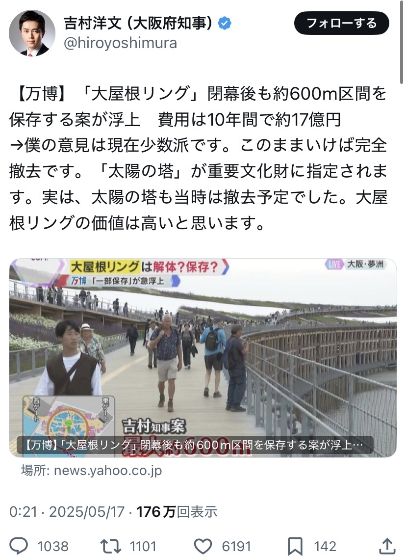 万博賛成派と反対派煽った奴らが自費で保存したら良いやん、イキッてたアホはそれくらいするよね?