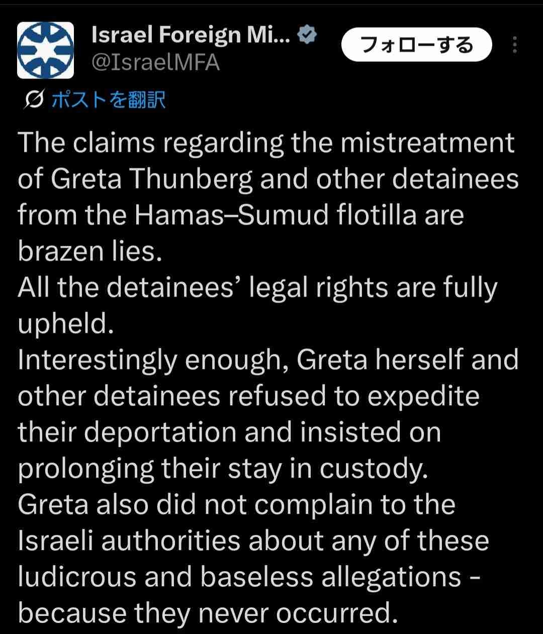 グレタ氏がこれらの馬鹿げた根拠のない疑惑についてイスラエル当局に一切苦情を申し立てなかったのも、そのような出来事が決して起こらなかったからです。BOARD Information greta - 5ちゃんねる掲示板greta.5ch.net - 2 : 2025/10/06(月) 08:46:06.82 ID:9nq3vgOx0