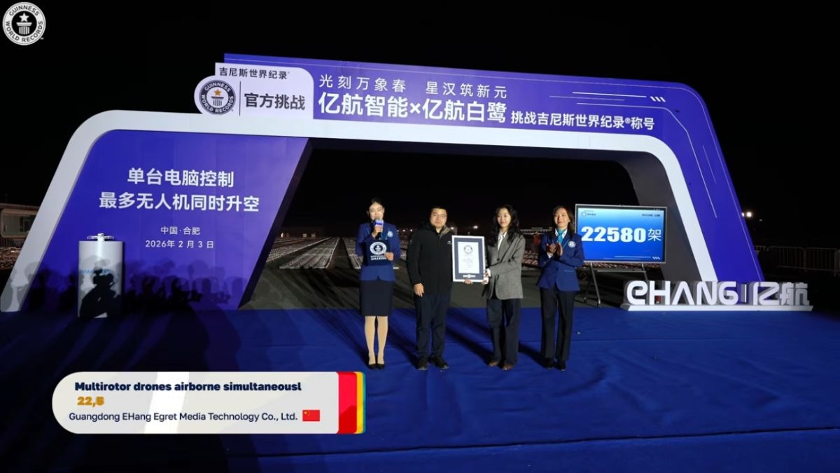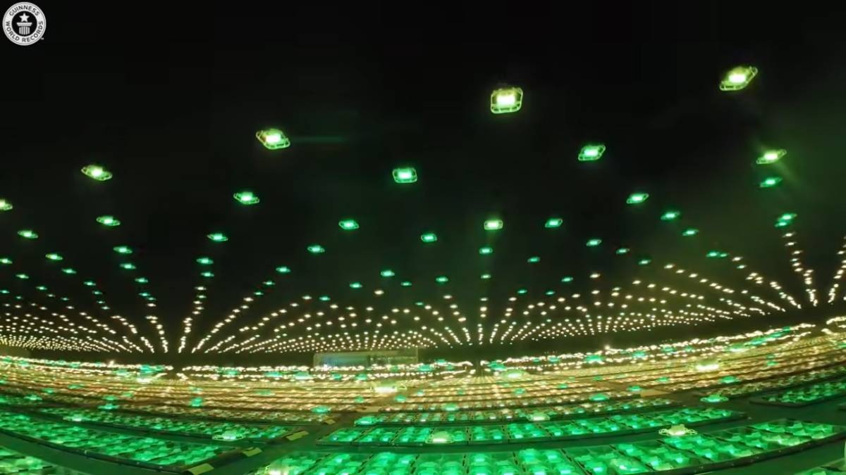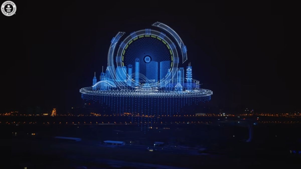 飛行は1台のコンピューターで制御され、夜空に緻密なフォーメーションを描く演出が展開された。公式の立会人が監視する中、20機が離陸に失敗したものの、最終的に2万2580機が飛行に成功。これにより、従来記録の1万5947機を大きく上回り、Guinness World Recordsの新記録として認定された。