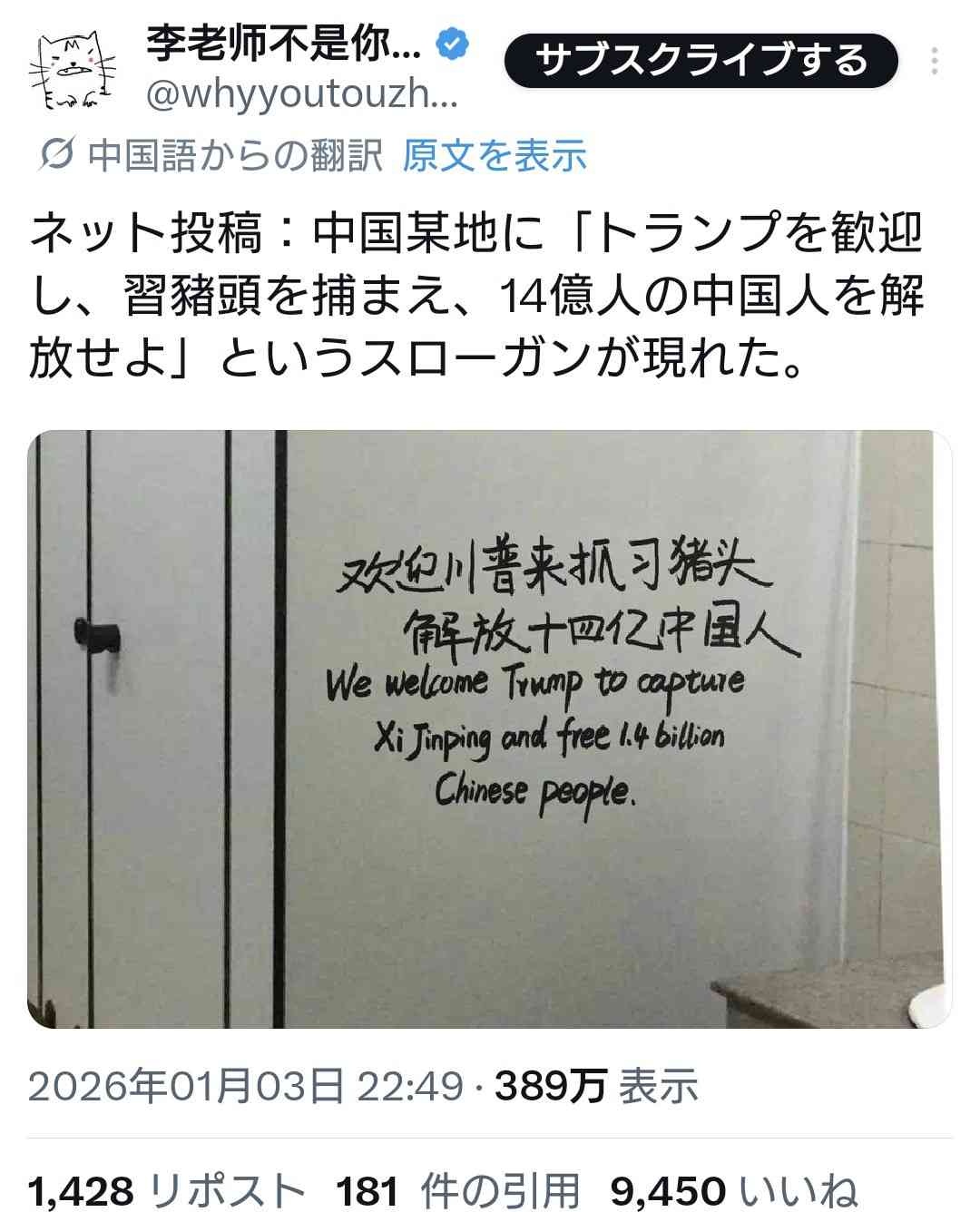 中国人「トランプ大統領、マドゥロと同じ独裁者である習近平も逮捕し14億人を解放してください!🙏」