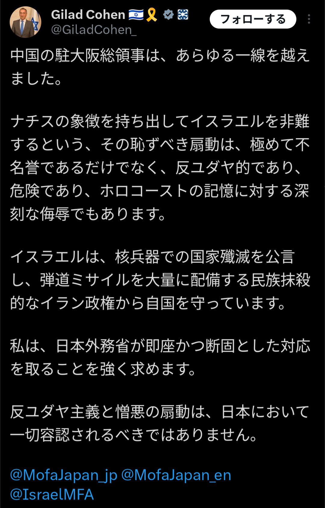 中国総領事「ナチスとイスラエルってほとんど一緒じゃんw」あれ、ちょっとハードル越えたっぽいかこれ?なお…