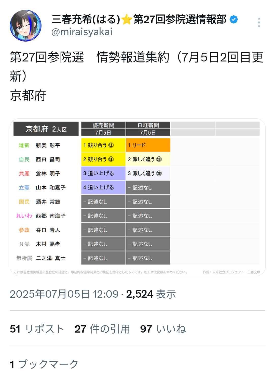まあ京都民主は歴史的に反共右派だから固まれないんだろうけど - 33 : 2025/07/05(土) 12:40:22.21 ID:Zc5PbY5y0