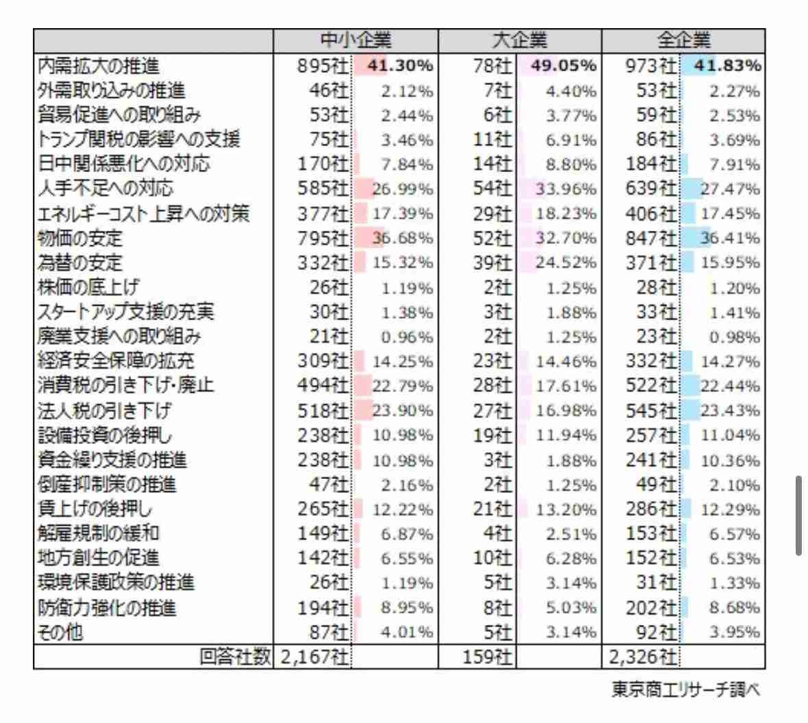 企業の7割、高市政権の経済対策支持。内需拡大要望41.8%、支持政党・自53.7%、中5.6%、国4.5%、維3.7%、参3.1%、み2.7%、なし24.8%