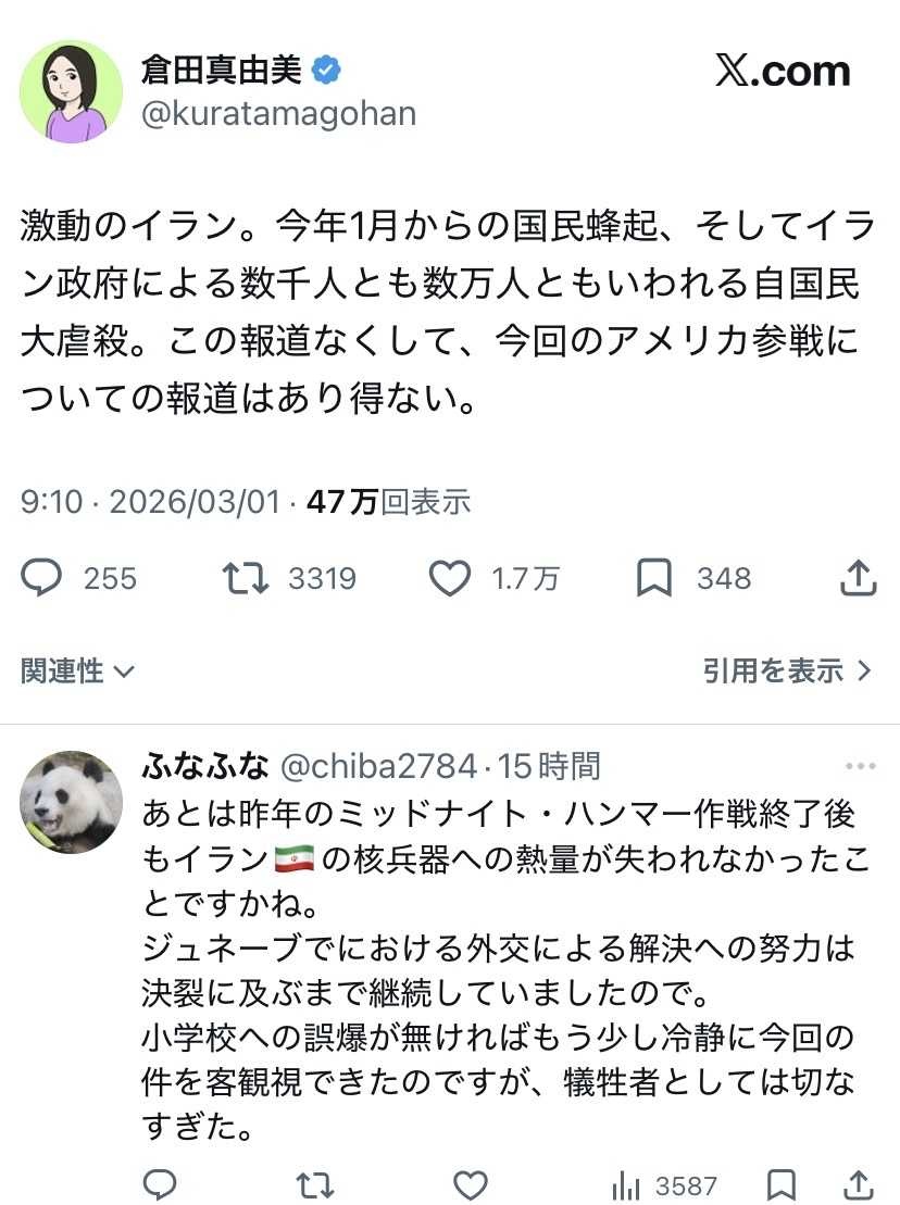 倉田真由美「イラン政府の自国民大虐殺を報じずに、アメリカ参戦だけ報じるのは有り得ない」