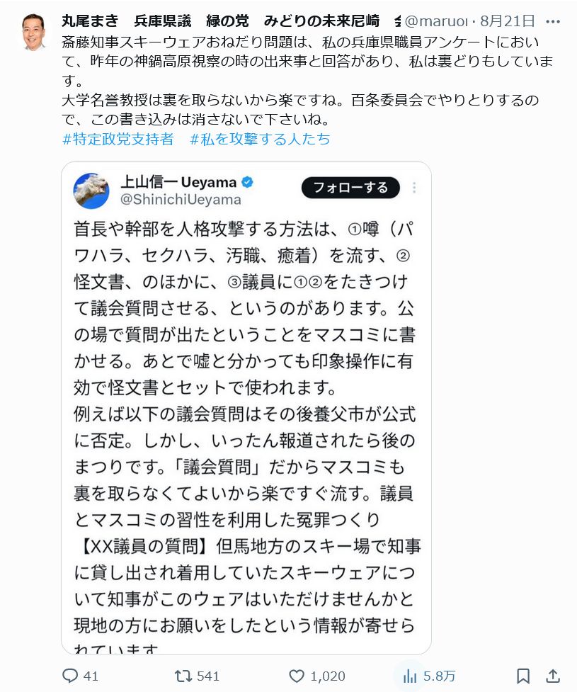 兵庫県丸尾まき議員「やっぱり斎藤はスキーウェアをおねだりしてたぞ!!!」⇢結果