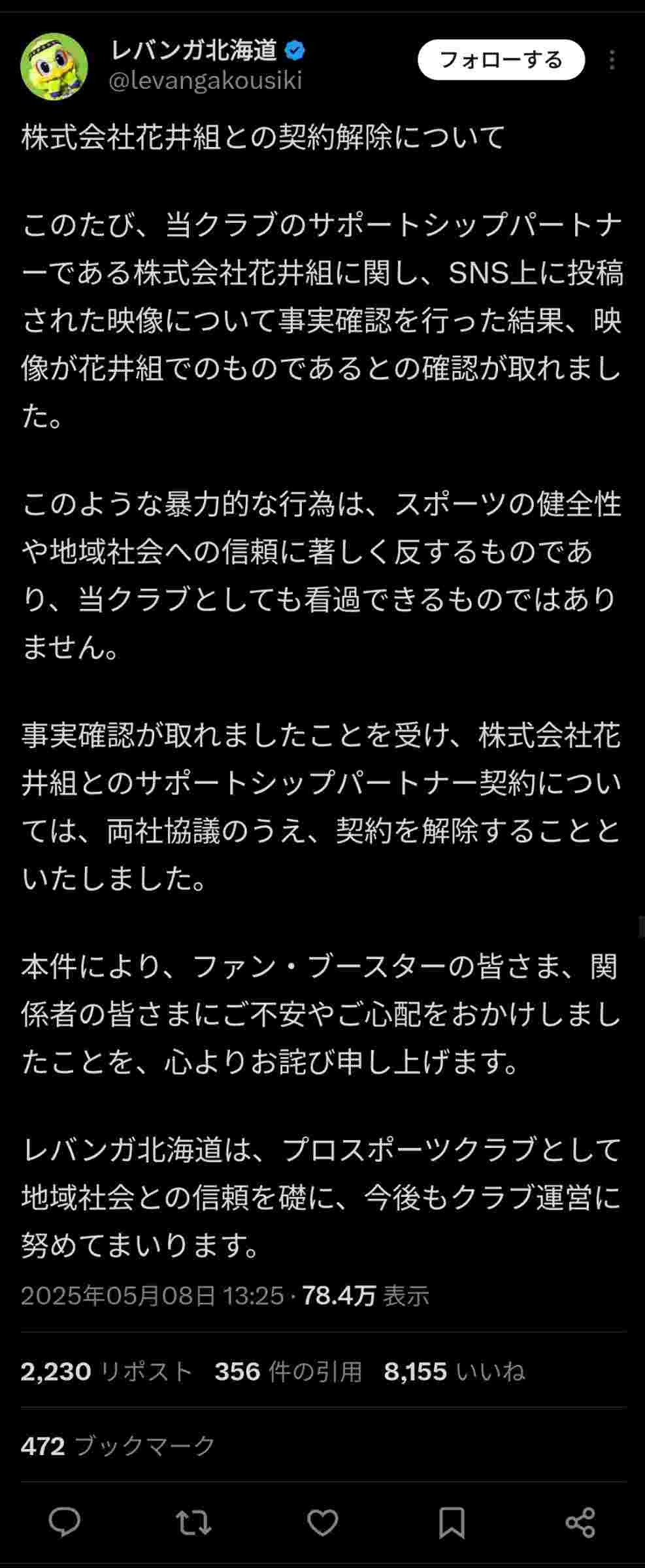 B1レバンガ北海道 「暴力的な行為」確認で建設会社とのスポンサー契約解除 「看過できるものではない」