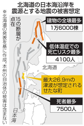 北海道は3日、日本海側が震源の巨大地震と津波による初の被害想定を発表し、道内の死者数は最大7500人に上るとした。地震を引き起こす沿岸の15の断層ごとに推計し、地震後に低体温症で死亡する恐れがある人が4100人に上ったり、建物の全壊が1万6千棟に達したりするケースも。北海道は早期避難で被害を減らせるとし、推計を基に減災計画を策定する。