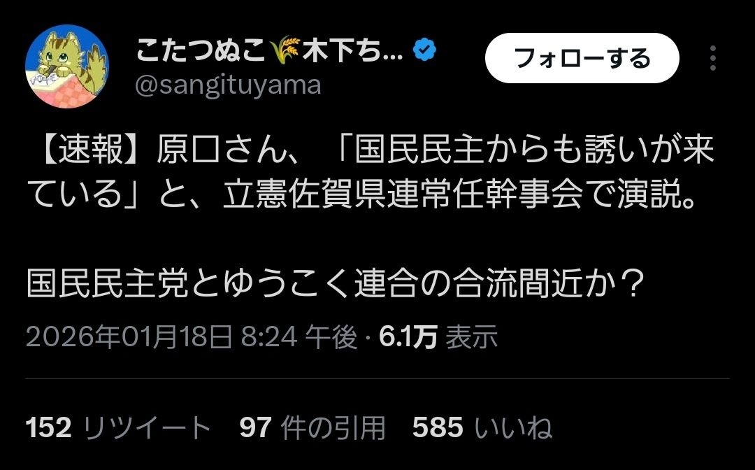 まあそんなんで玉木榛葉体制の間にどれだけ人増えるんだって話だからそりゃ焦って変なの誘うわな - 36 : 2026/01/19(月) 00:55:16.12 ID:ZRxk1rHD0