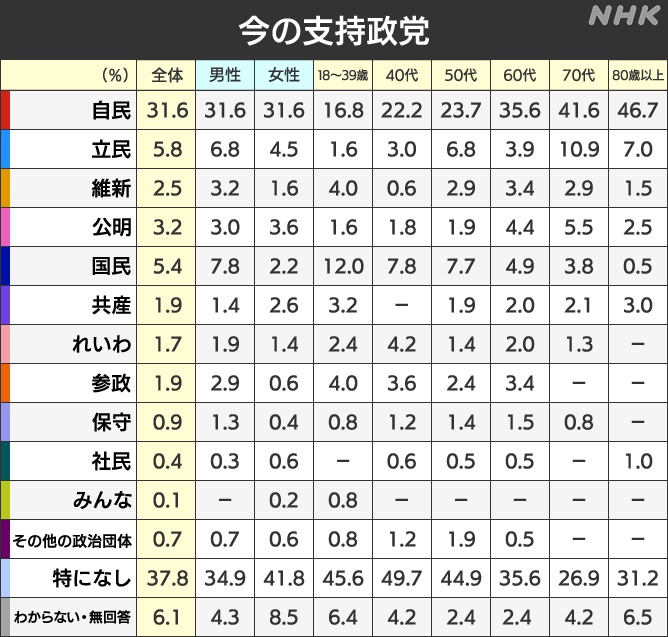 NHK【政党支持率】6月世論調査(18歳~39歳)年代別支持率