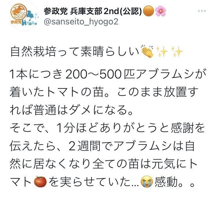 参政党「1分ほどありがとうと感謝を伝えたら、トマトの苗からアブラムシは自然に居なくなり全ての苗は元気になった」