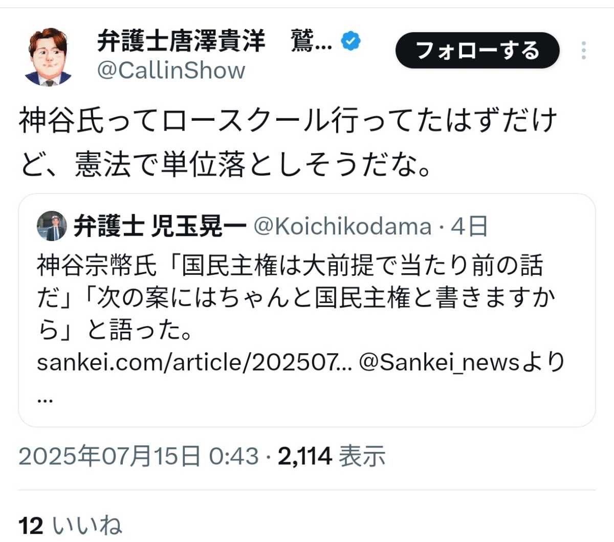 - 神谷の元ブレーンだった憲政史家「国家が主権を持つという文を国民から主権がなくなると解釈するのはさすがに稚拙。反対意見にも程度というものがある。」