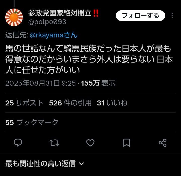 参政党🟠支持者「馬の世話は騎馬民族であった日本人が世界で最も得意」ホルホルッ