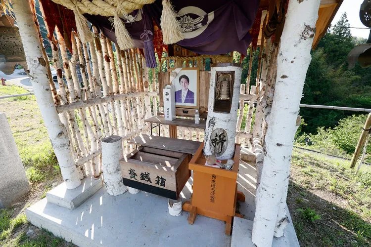 奈良県吉野にある世界遺産・吉水神社の名誉宮司である佐藤素心氏が私費を投じて2023年に建立し、主祭神は安倍晋三大人命(あべしんぞう うしのみこと)。神社といっても、生木を組み合わせたような鳥居の奥に茅葺きと思われる屋根だけの祠があり、安倍氏の写真の前に小さな賽銭箱が置かれているものだ。