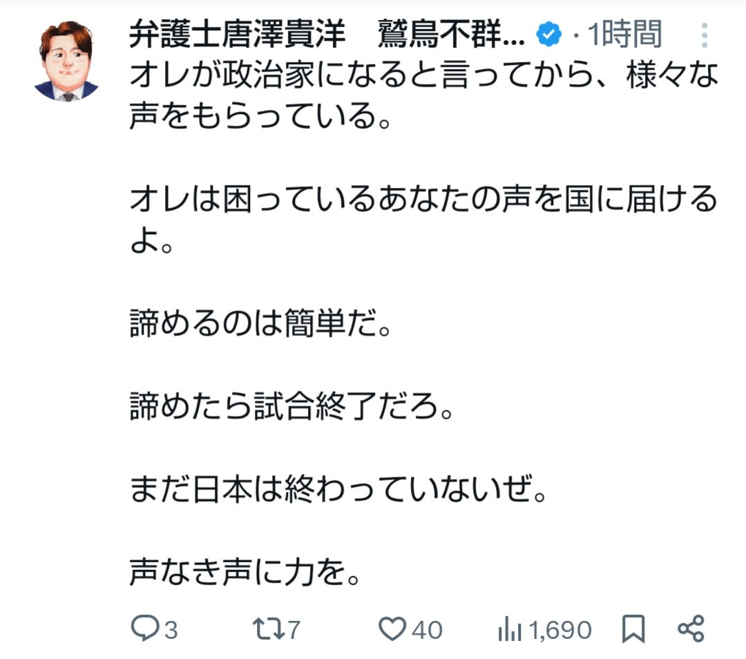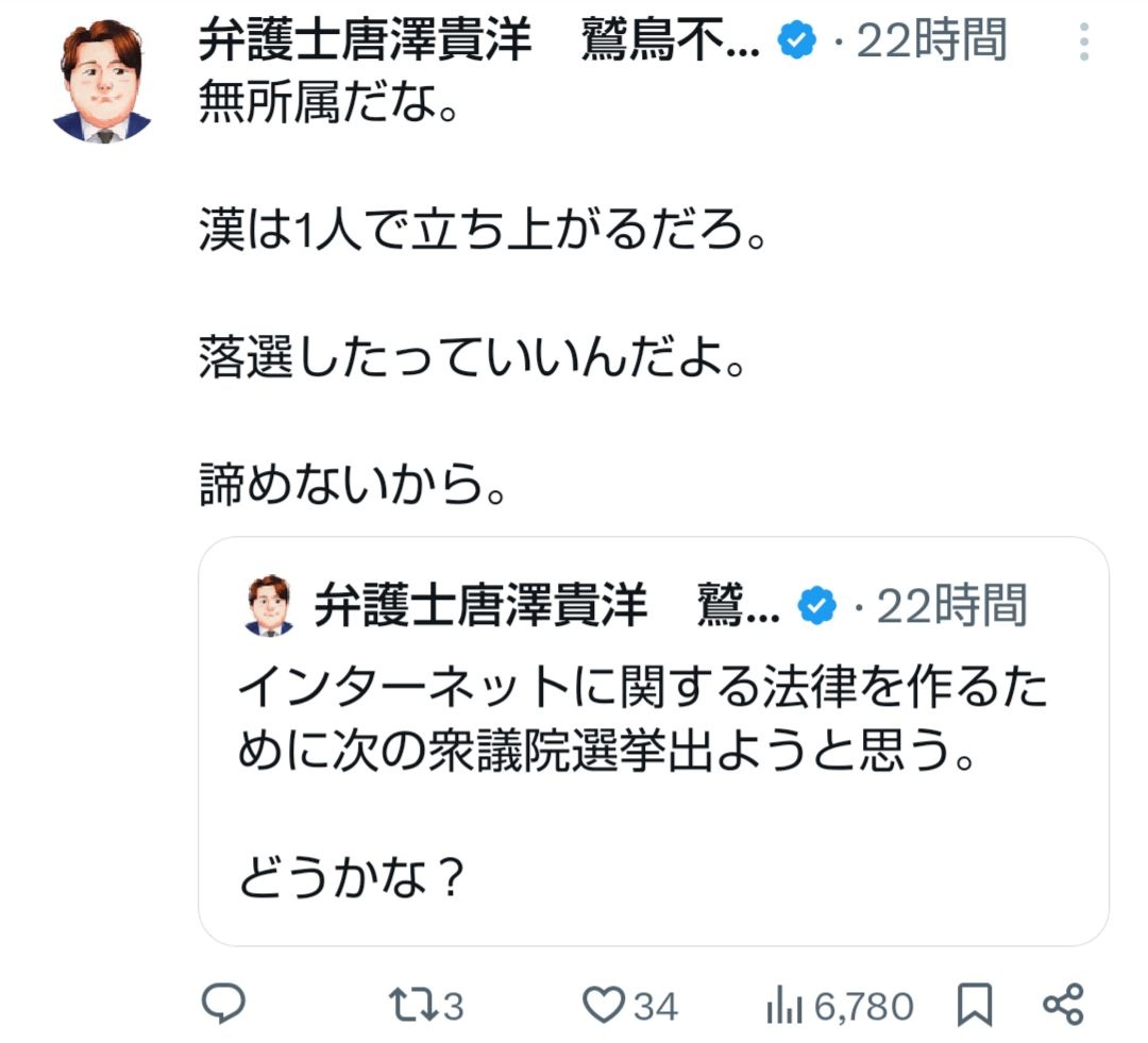 - 今は弁護士オンリーだから不祥事を一弁に見逃してもらってるけど議員候補になったら世論に正面からぶっ叩かれるだろ