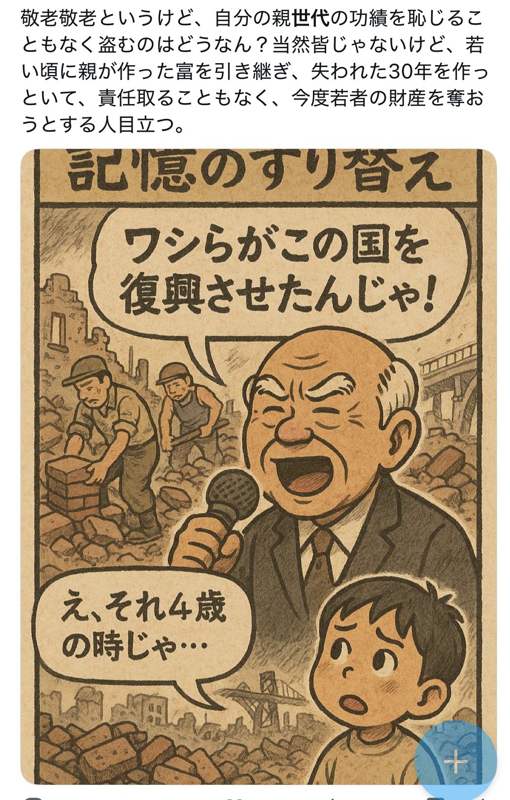 団塊老人って…自分たちが子孫に迷惑かけ、さらに日本を壊してしまった自覚がないんだろう?総嘘つき世代なの?