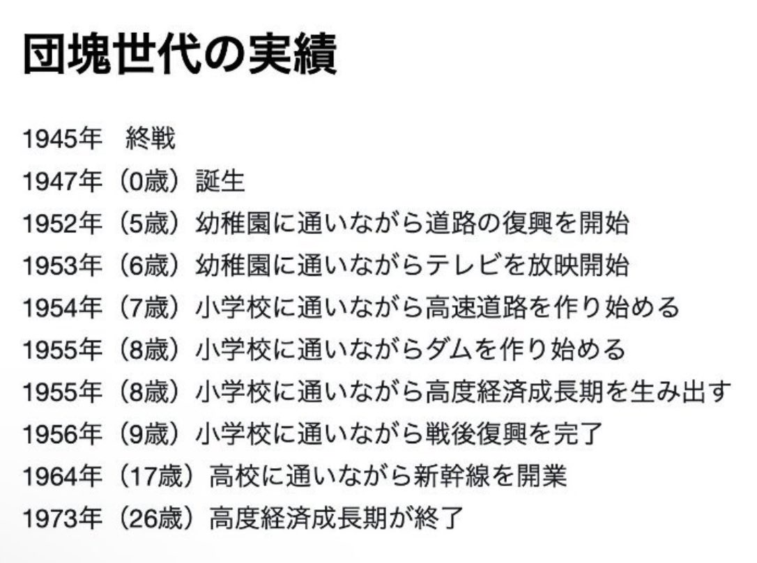 この世代が戦後復興したわけでも高度成長期なしとげたわけでもありません。