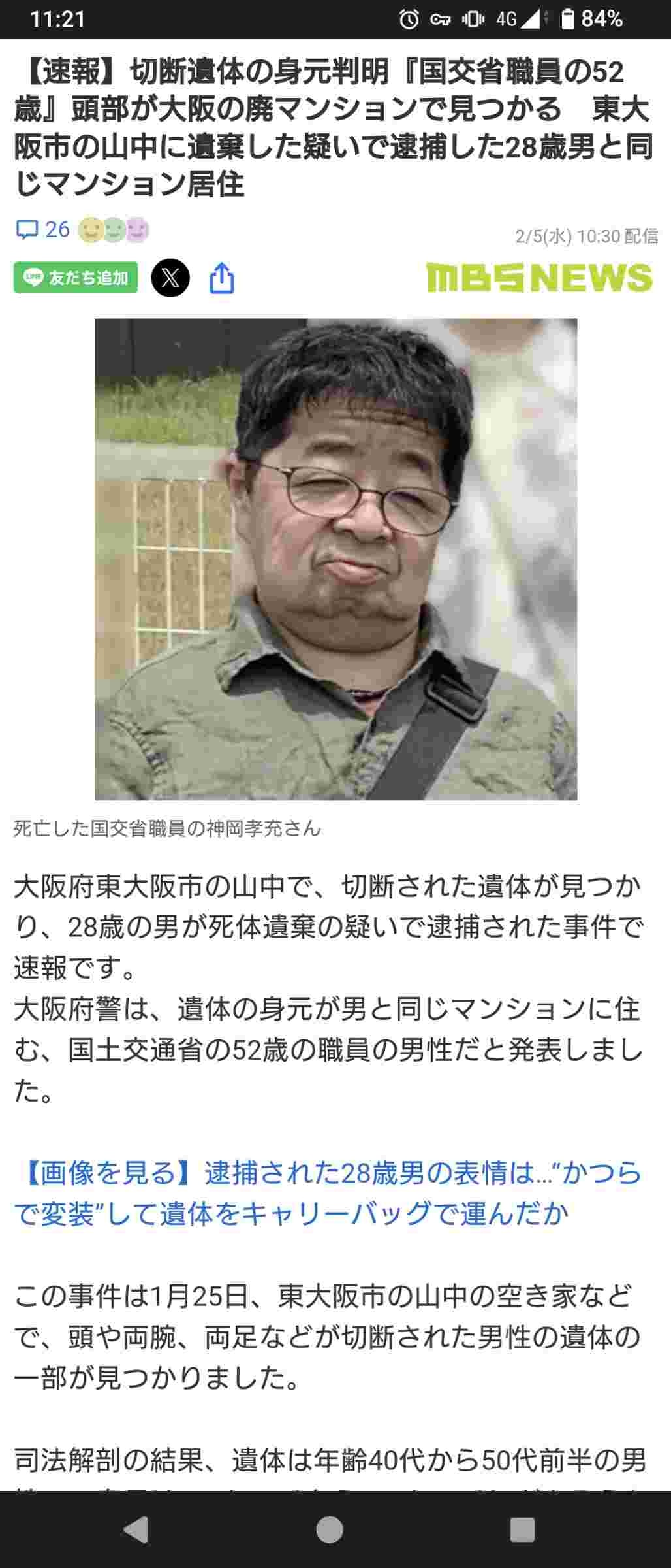 - 【速報】切断遺体の身元判明『国交省職員の52歳』頭部が大阪の廃マンションで見つかる 東大阪市の山中に遺棄した疑いで逮捕した28歳男と同じマンション居住
