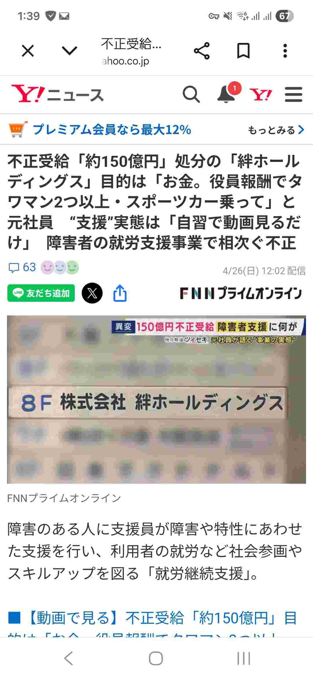 不正受給「約150億円」処分の「絆ホールディングス」目的は「お金。役員報酬でタワマン2つ以上・スポーツカー乗って」と元社員 “支援”実態は「自習で動画見るだけ」 障害者の就労支援事業で相次ぐ不正(FNNプライムオンライン) - Yahoo!ニュース障害のある人に支援員が障害や特性にあわせた支援を行い、利用者の就労など社会参画やスキルアップを図る「就労継続支援」。 暮らしの安定や自立を支える大切な制度ですが、「絆(きずな)ホールディングス」とnews.yahoo.co.jp - 2 : 2026/04/26(日) 13:43:10.73 ID:m51Hf+3D0