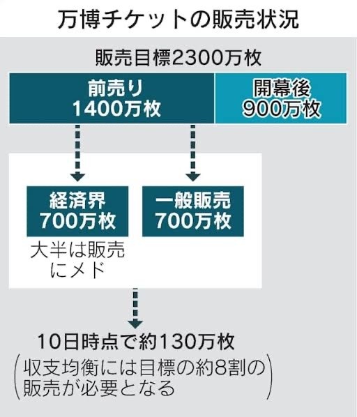 - 目標1400万枚の達成困難 前売り券低迷、赤字懸念も 万博開幕まで1カ月