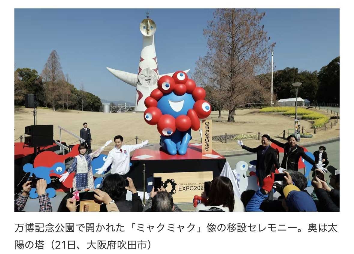 東ゲート付近に設置されていたミャクミャク像「いらっしゃい」(高さ3.85メートル)が同公園内の「太陽の広場」、西ゲート近くの「ワクワク」(同)が「平和のバラ園」の前にそれぞれ設置された。展示は5月末までの予定。