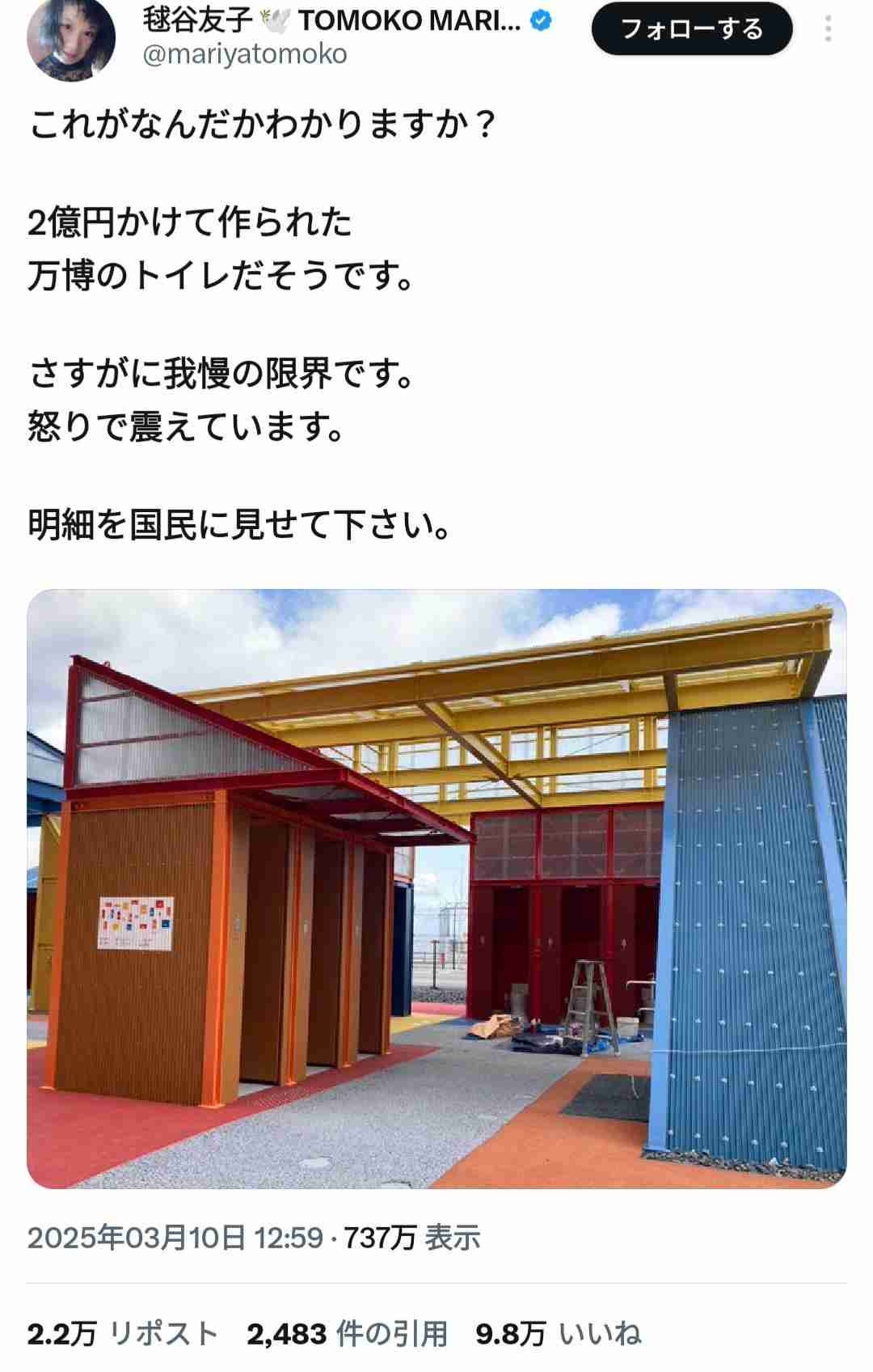 大阪万博さん、2億円かけてとんでもないトイレを作り上げてしまう ←9.8万いいねwww
