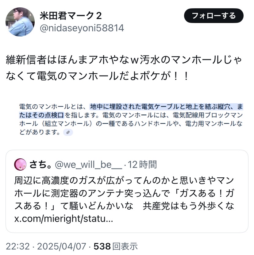 ※下水にメタンガスがあるのは普通、ガスの測定をしたのは電気のマンホール