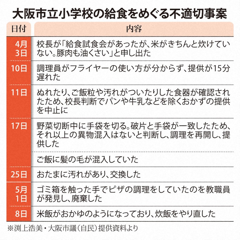 大阪市の学校給食、劣化の一途…破れた手袋で調理、ゴミ箱を触った手で調理、毛の混入、汚れの落ちてない食器、米が炊けてない、肉が臭い