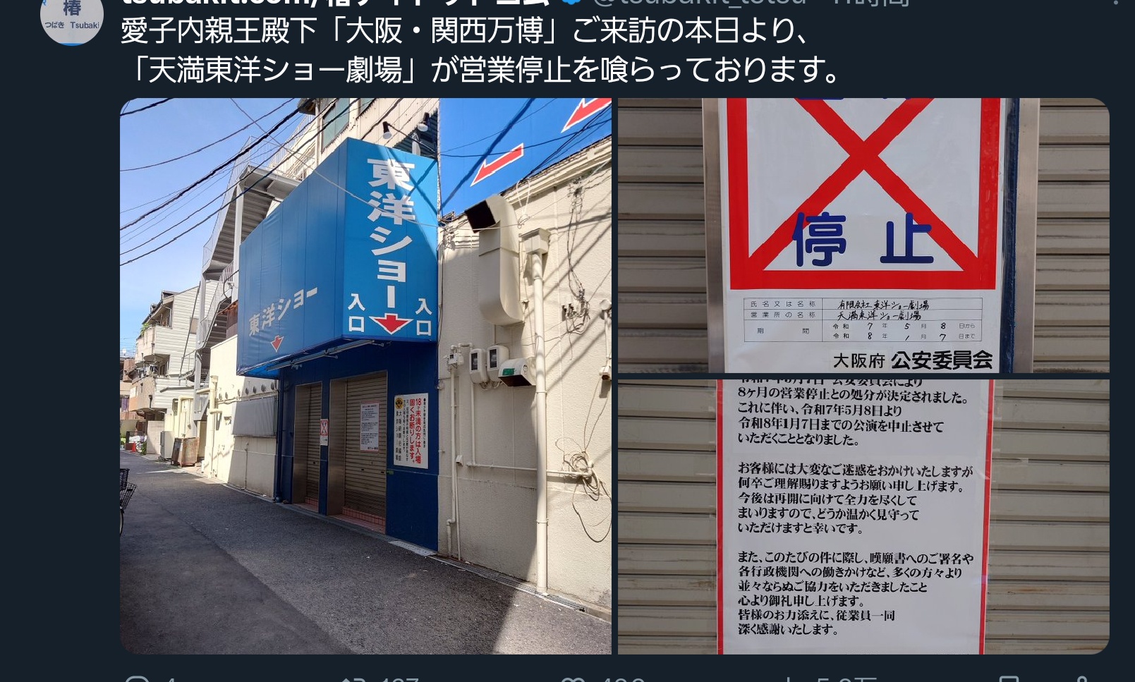 天満のストリップ・東洋ショー、万博期間中営業停止処分…