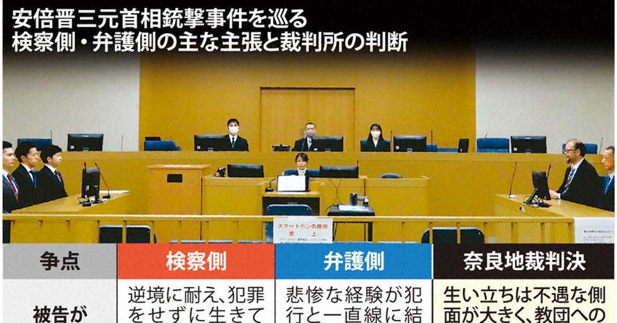 - 弁護側は公判で、教団の被害救済に取り組む全国霊感商法対策弁護士連絡会(全国弁連)の弁護士を証人として呼び、安倍氏と教団のつながりの深さの立証を試みていた。だが、判決は安倍氏と教団の関係性に踏み込まず、安倍氏には「落ち度」は何ら見当たらないと認定して、被告の教団に対する怒りと、安倍氏への銃撃には「大きな飛躍がある」と断定。被告の過酷な生い立ちを被告に有利な事情として考慮しなかった。