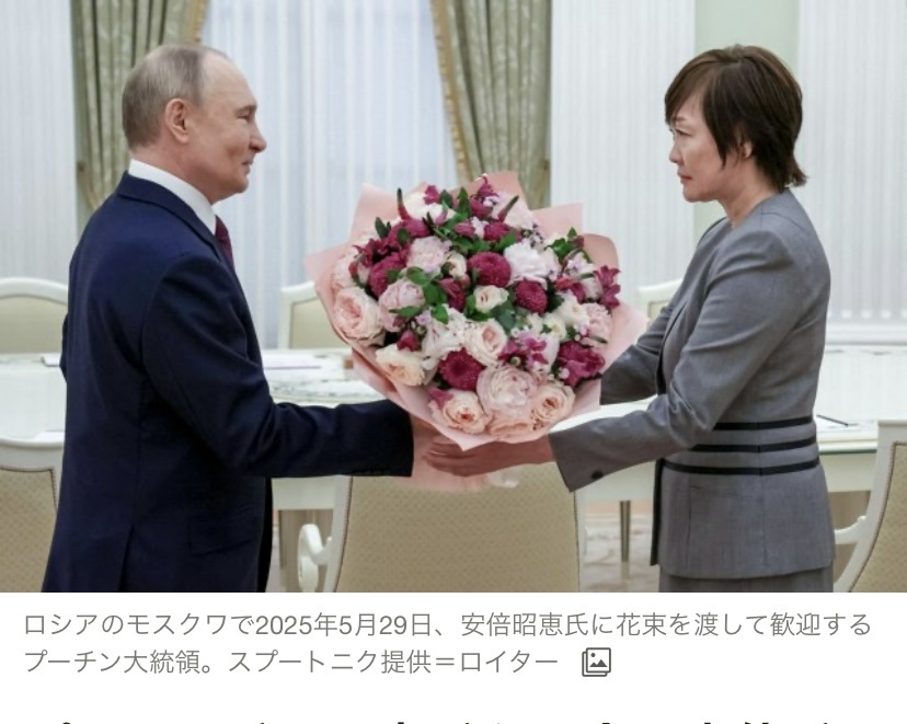 ロシアのプーチン大統領は故安倍晋三元首相の妻の昭恵さんとモスクワのクレムリン(大統領府)で面会した。大統領府が29日に発表した。日本政府がウクライナ侵攻を理由にロシアに制裁を科す中、異例の招待。プーチン政権はトランプ米政権と関係の正常化に乗り出しており、日本にも融和のシグナルを送った可能性がある。<下へ続く>