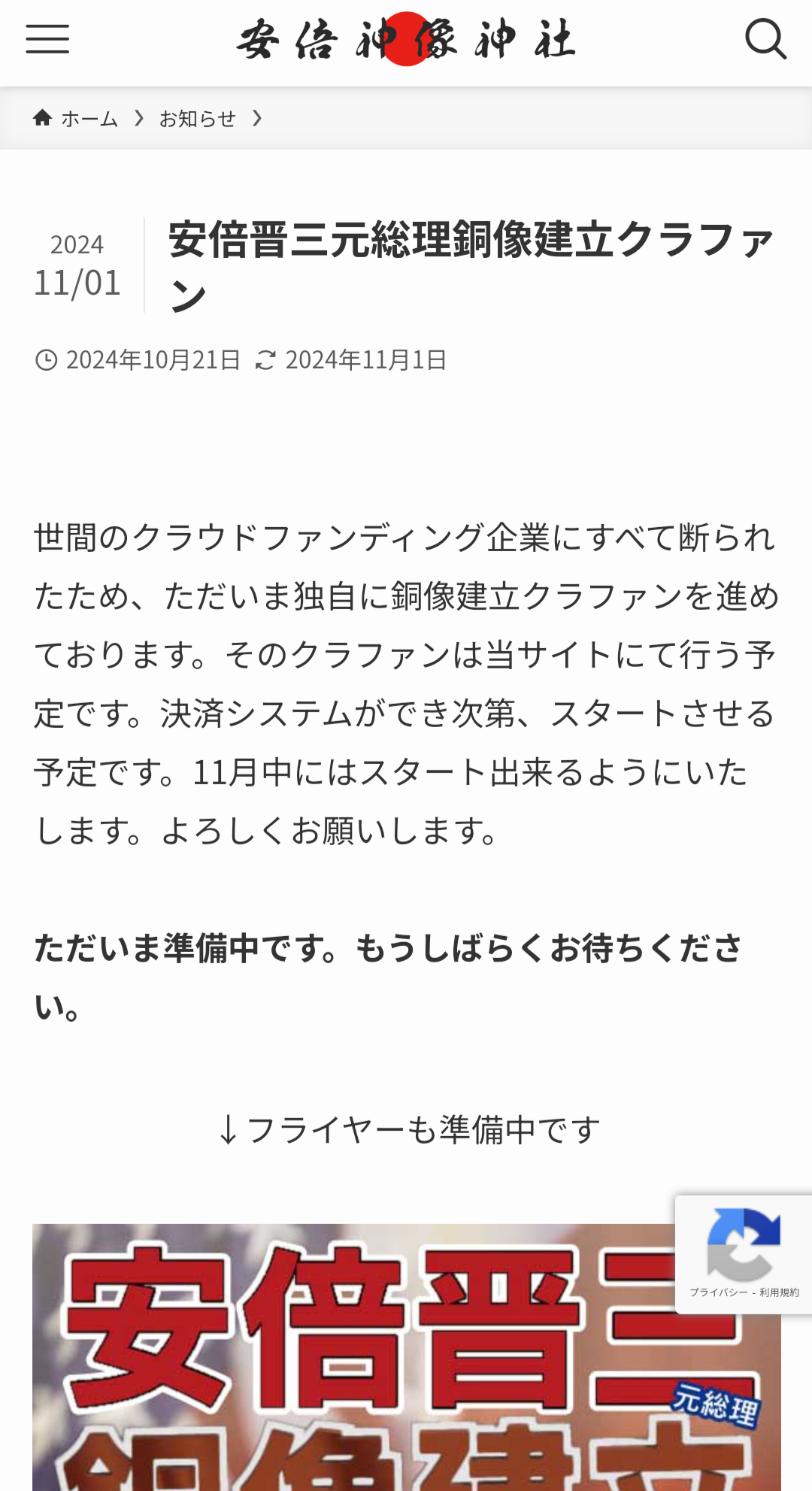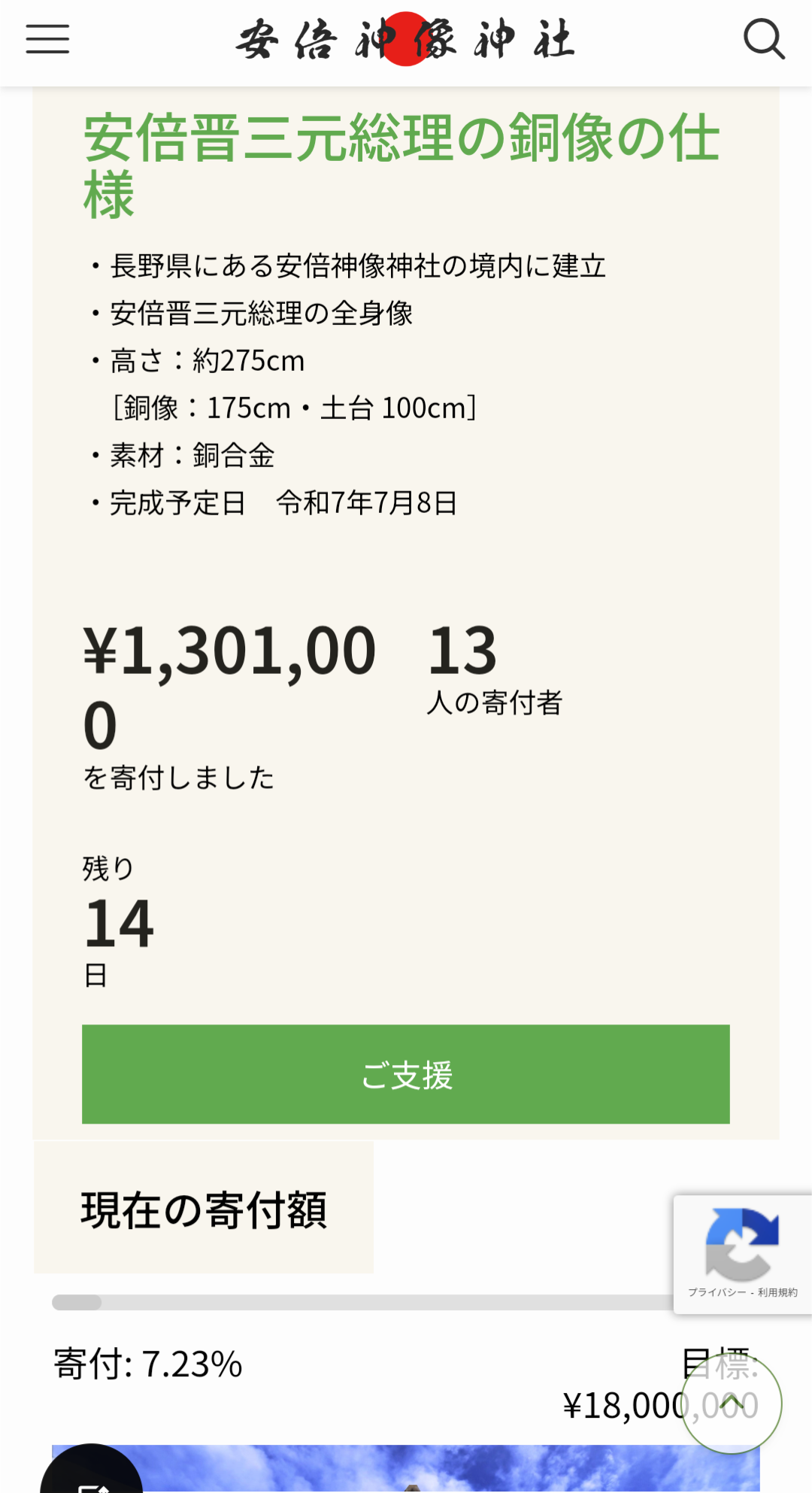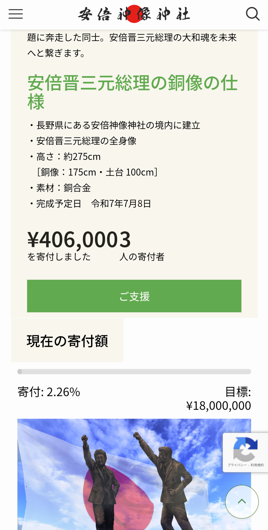 安倍晋三銅像プロジェクトのクラウドファンディング、終了まで残り2週間を前にして遂に7%を突破!!!いっけえええええええ!!!!