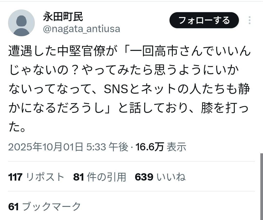 官僚「一回高市を総理にすればいいんじゃないの?やってみたら思うようにいかないってなって、ネットの人たちも静かになるだろうし」