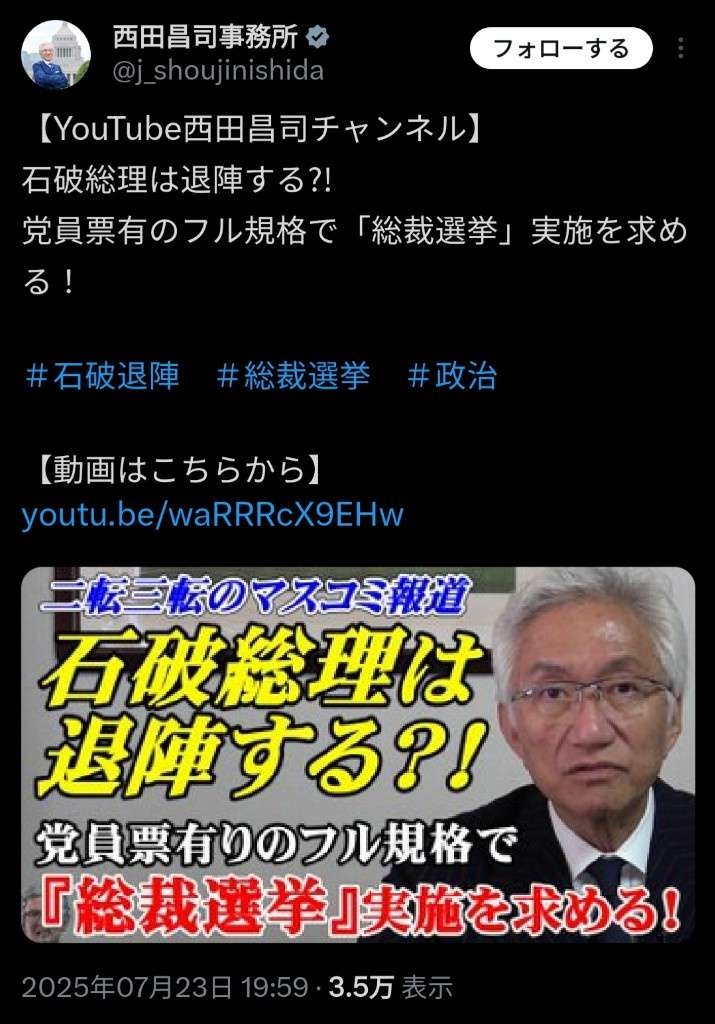 西田昌司が急先鋒にいるのほんま草生える - 9 : 2025/07/24(木) 17:53:54.26 ID:YiKqK1Hj0