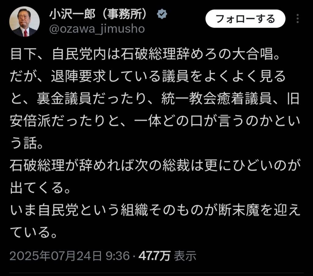 小沢一郎「石破辞めろと言っている議員をよく見てください」