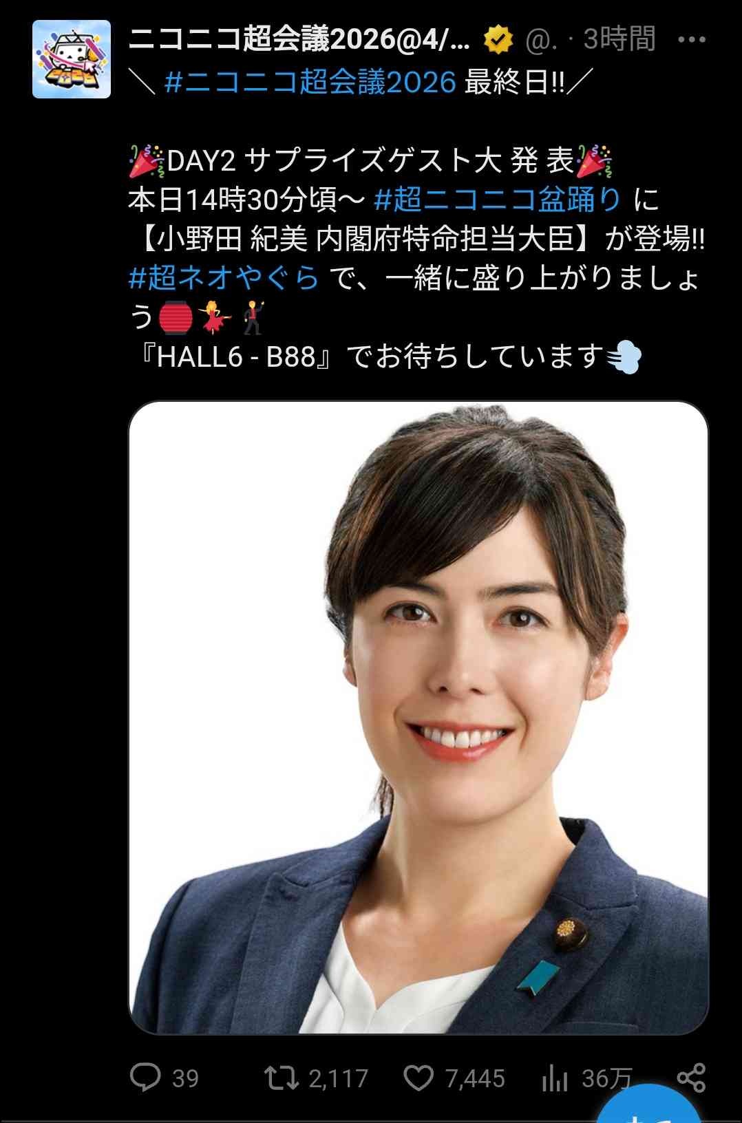 小野田紀美経済安全保障担当大臣、ニコニコ超会議に登場