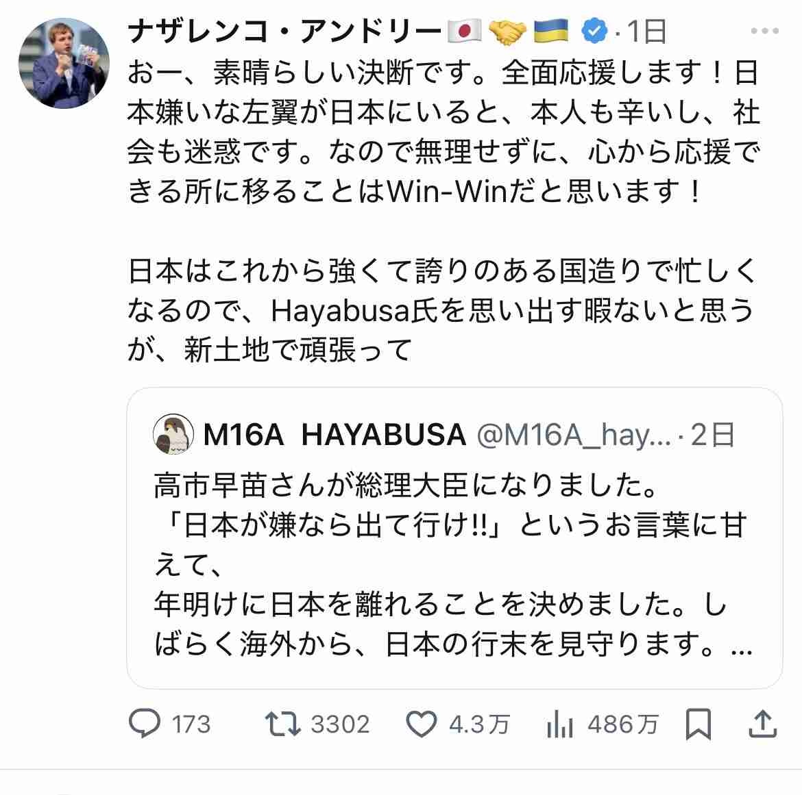 左翼「高一が首相になったから日本から出ていく」ナザレンコ「素晴らしい!日本嫌いな左翼がいると、本人も辛いし社会も迷惑」