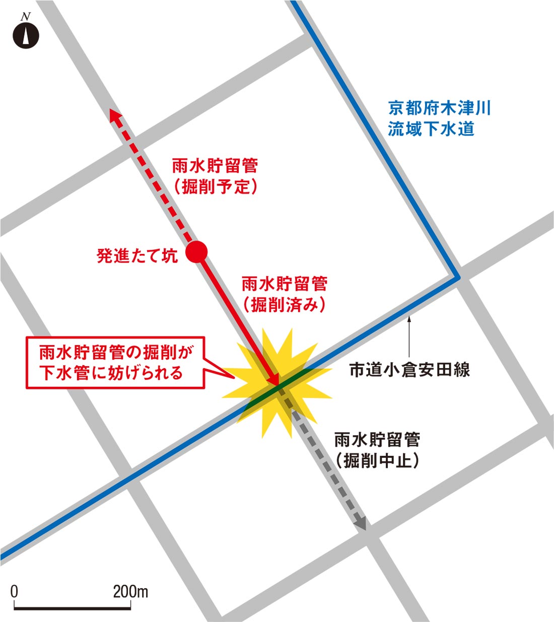 市は20年8月、工事を浅沼組・田中創建(宇治市)JV(共同企業体)に約8億9000万円(当初)で発注。23年4月25日、発進たて坑から約273m掘り進めたところで、京都府が管理する木津川流域下水道の管路に遮られて掘削機が停止した