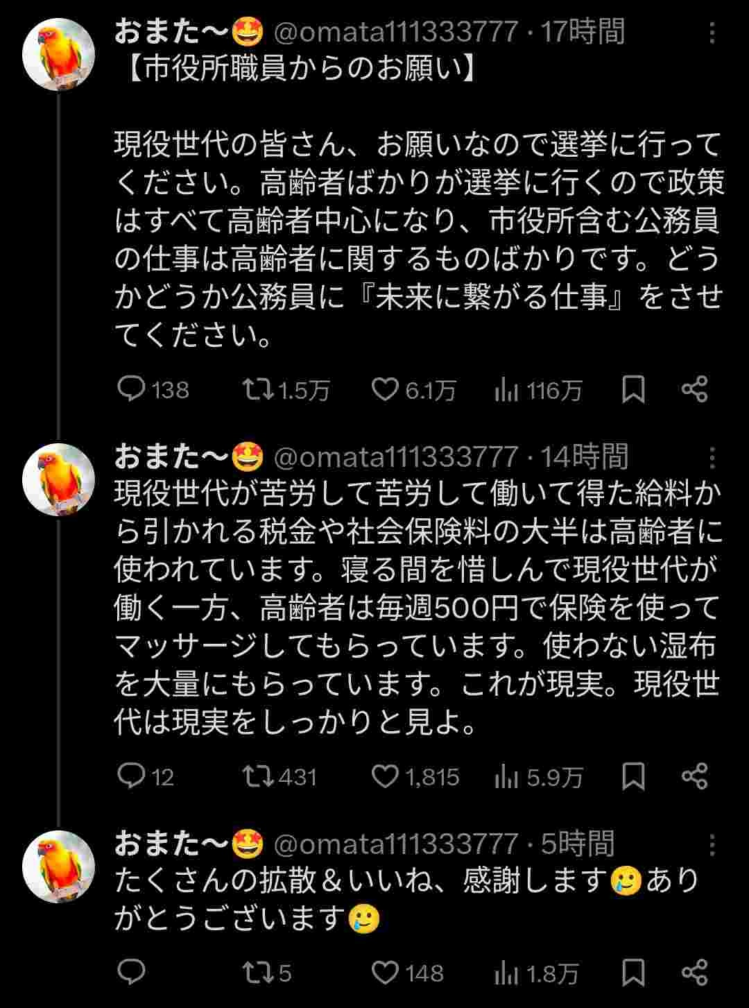 市役所職員「若者の皆さんお願いだから選挙行って。ジジババのために税金使われていいの!?」6万いいね