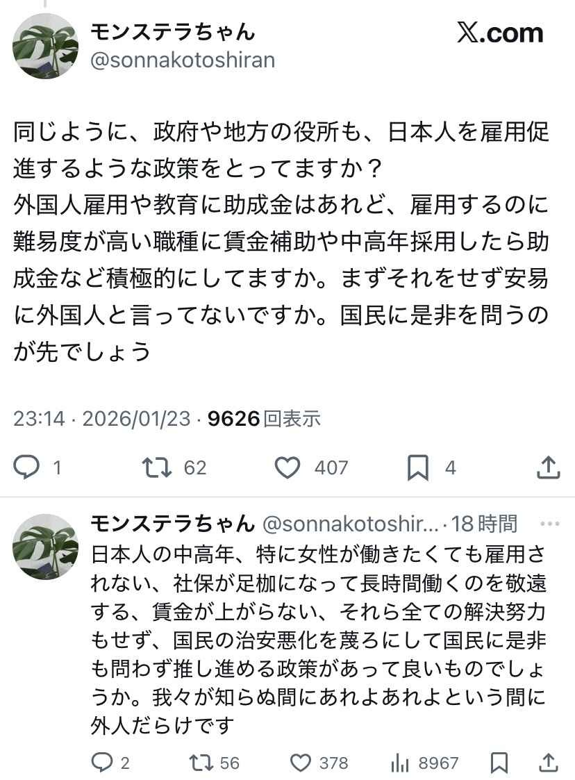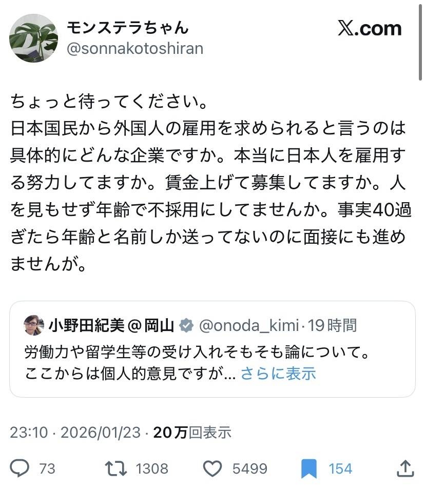 外国人いれるような不人気な職種は中年も雇うけど断るのは相当な理由があるんだろうな - 80 : 2026/01/24(土) 18:21:07.09 ID:RaB8AP1o0