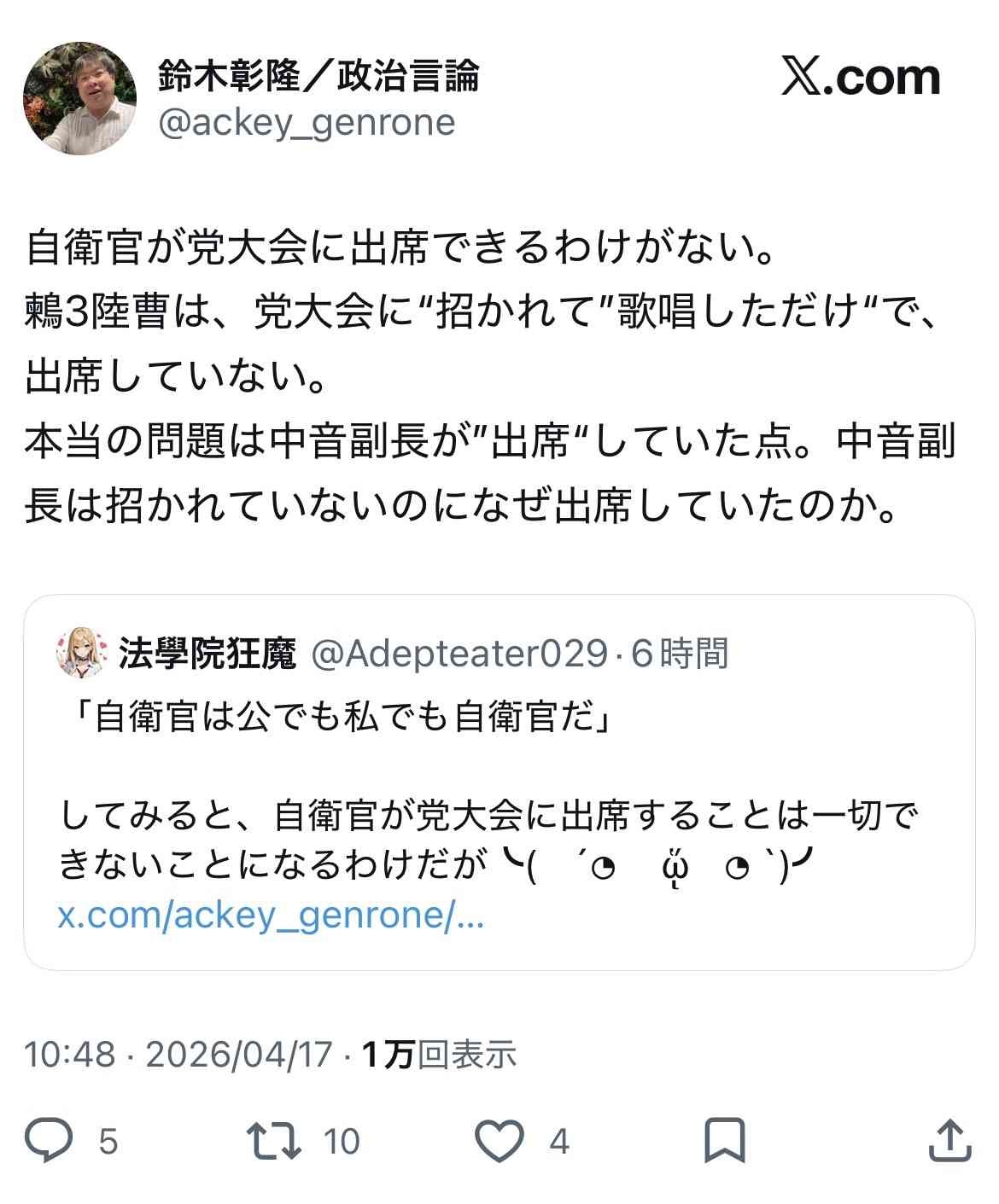 愛国者「鶫3陸曹は自民党大会に”招かれて歌っただけ”、出席じゃないのでセーフ」